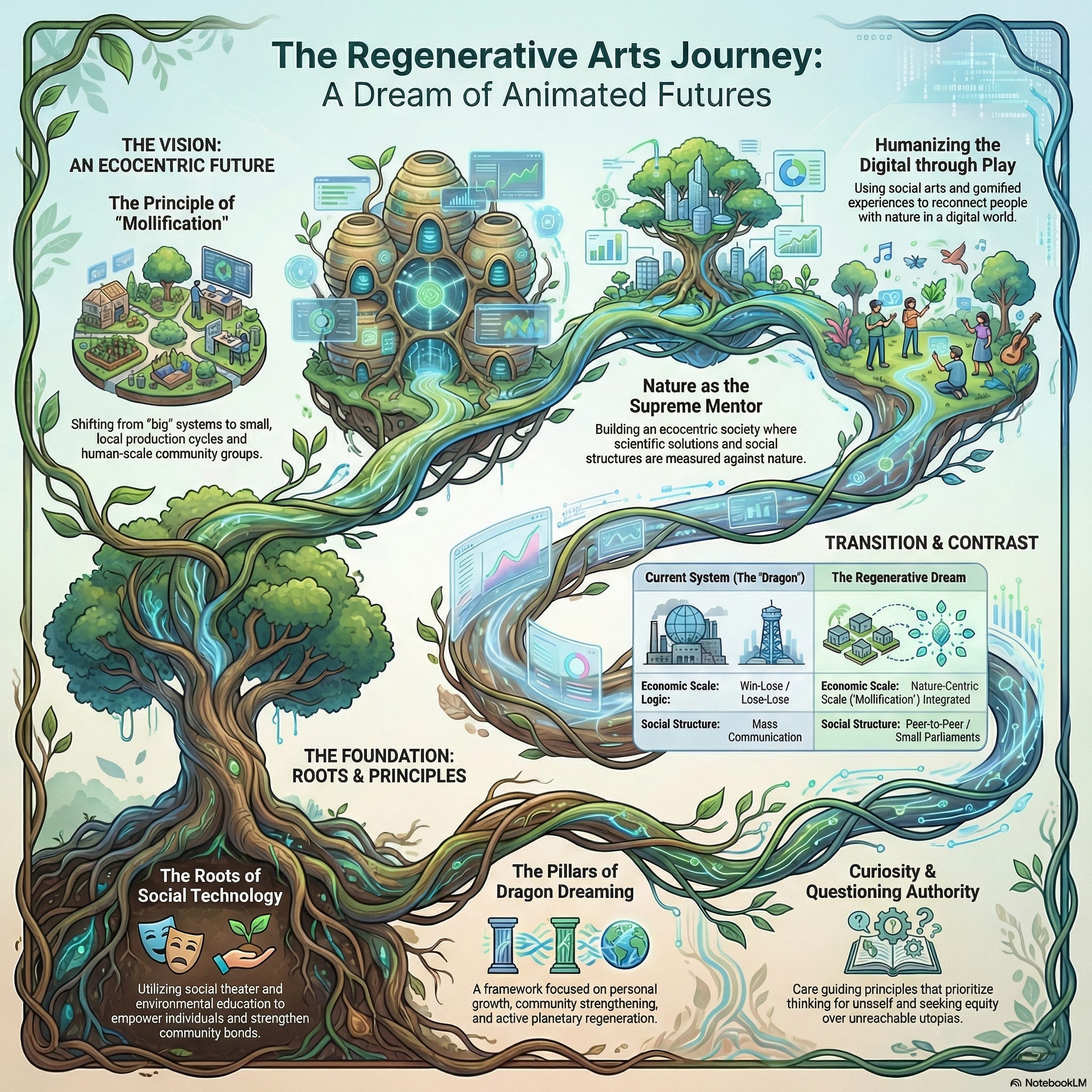 This month’s Living Library revisits a flashback episode from the first season of Imagine Action: Social Arts Across Borders, returning to a conversation recorded over five years ago with Ravi Resck, presented as a time-travel capsule whose insights remain strikingly relevant today. Ravi reflects on how growing up within a family engaged in social-environmental theatre and grassroots social entrepreneurship in Brazil shaped his commitment to curiosity, social justice, and independent thinking. Looking ahead, Ravi shares a vision of an ecocentric society grounded in “mollification,” shifting from large centralized systems toward localized cycles of production and care, and concludes by reflecting on the ImaginAction network as a living organism sustained through shared rituals, transparent onboarding, and light, adaptable agreements rather than rigid institutional structures.